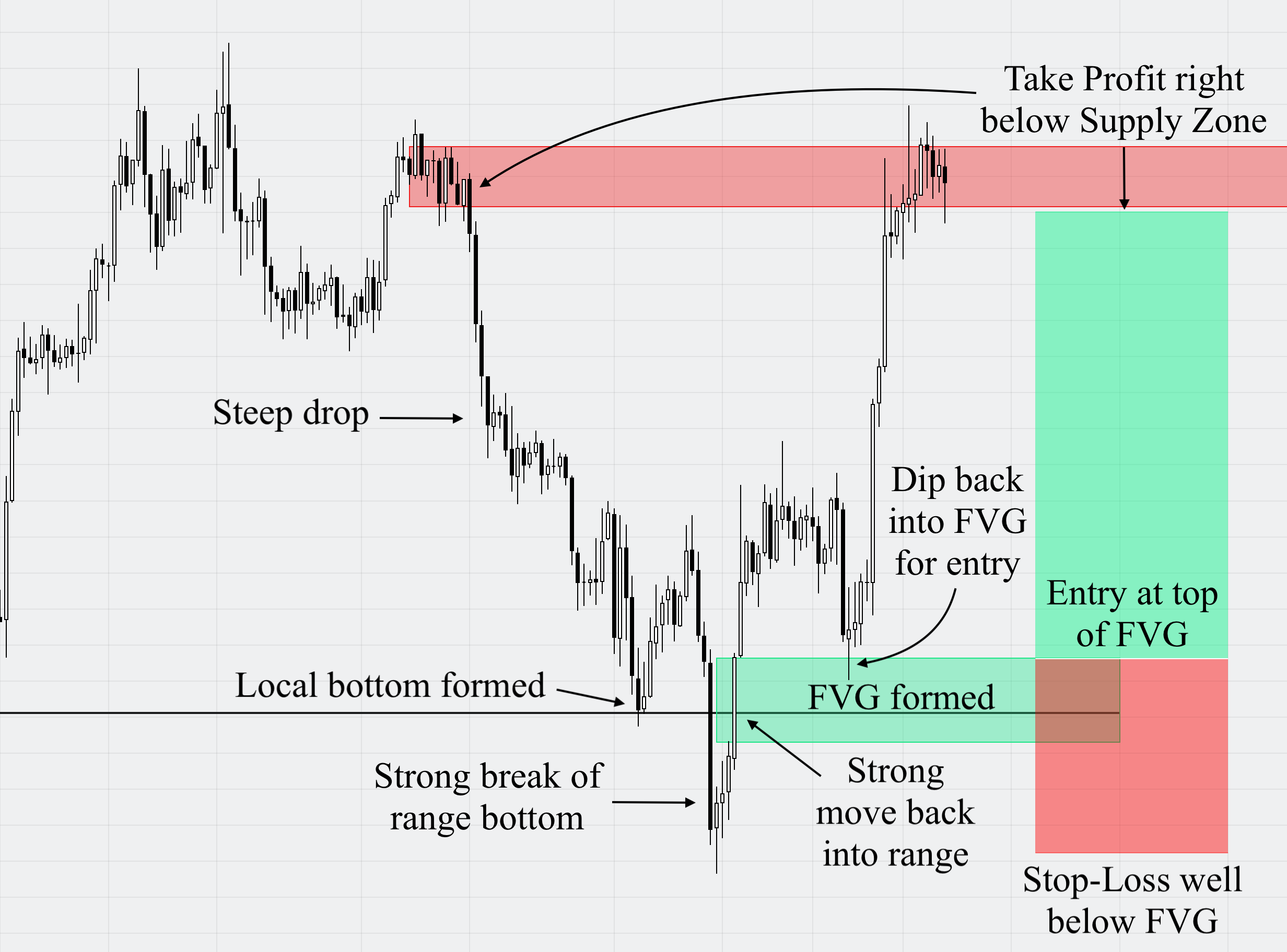 After the manipulation and initial impulse back to the range, price should hopefully return to the liquidity zone formed around the manipulation. This means you are not trying to trade the manipulation itself or the move immediately after, rather, you are waiting to trade the retest of the zone where the liquidity is if/when price retraces back to it.
