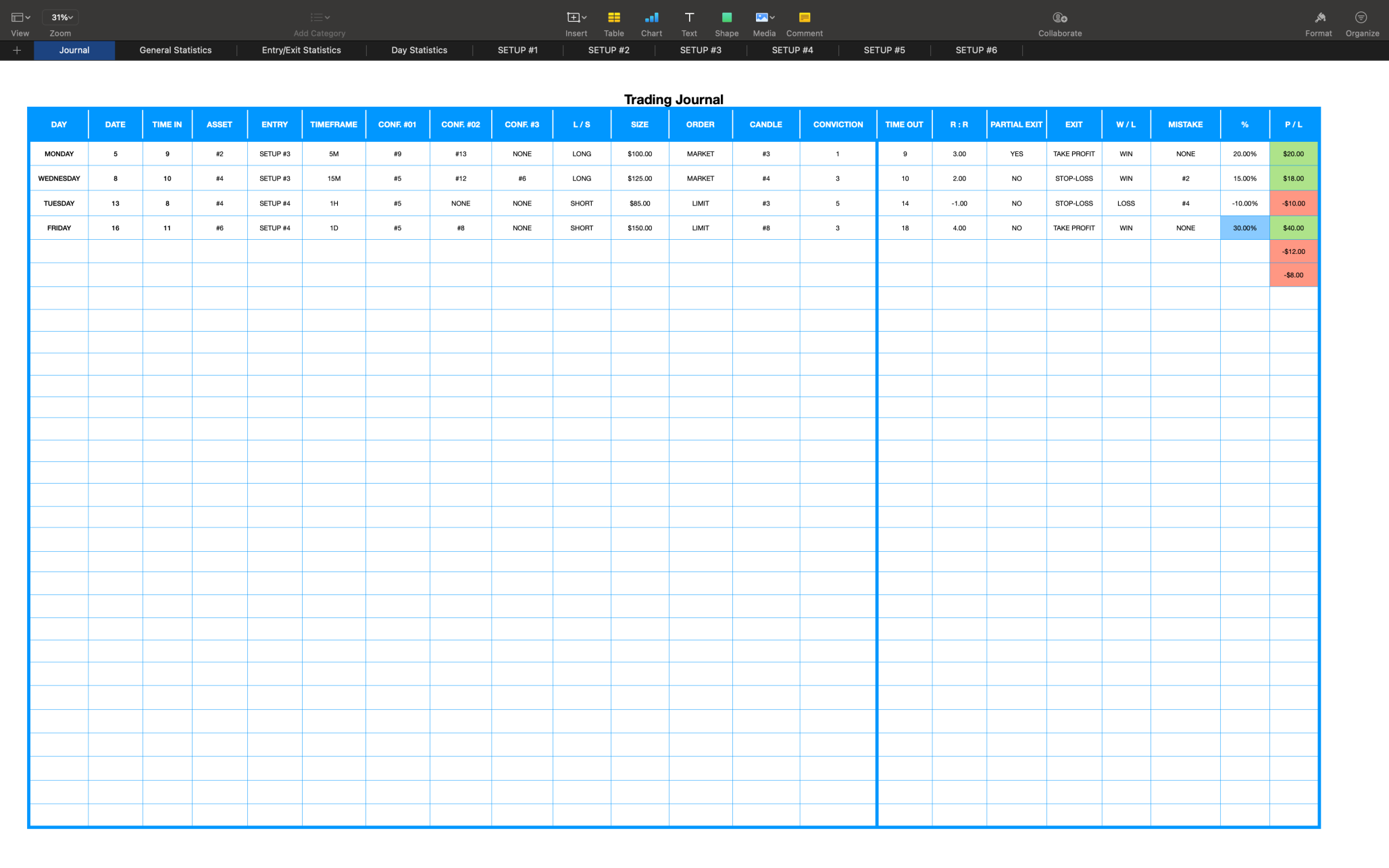 This trading journal allows you to input your own markets, strategies, confluences, mistakes and candle setups to track your overall trading performance as well as the individual performance of up to six separate entry setups.