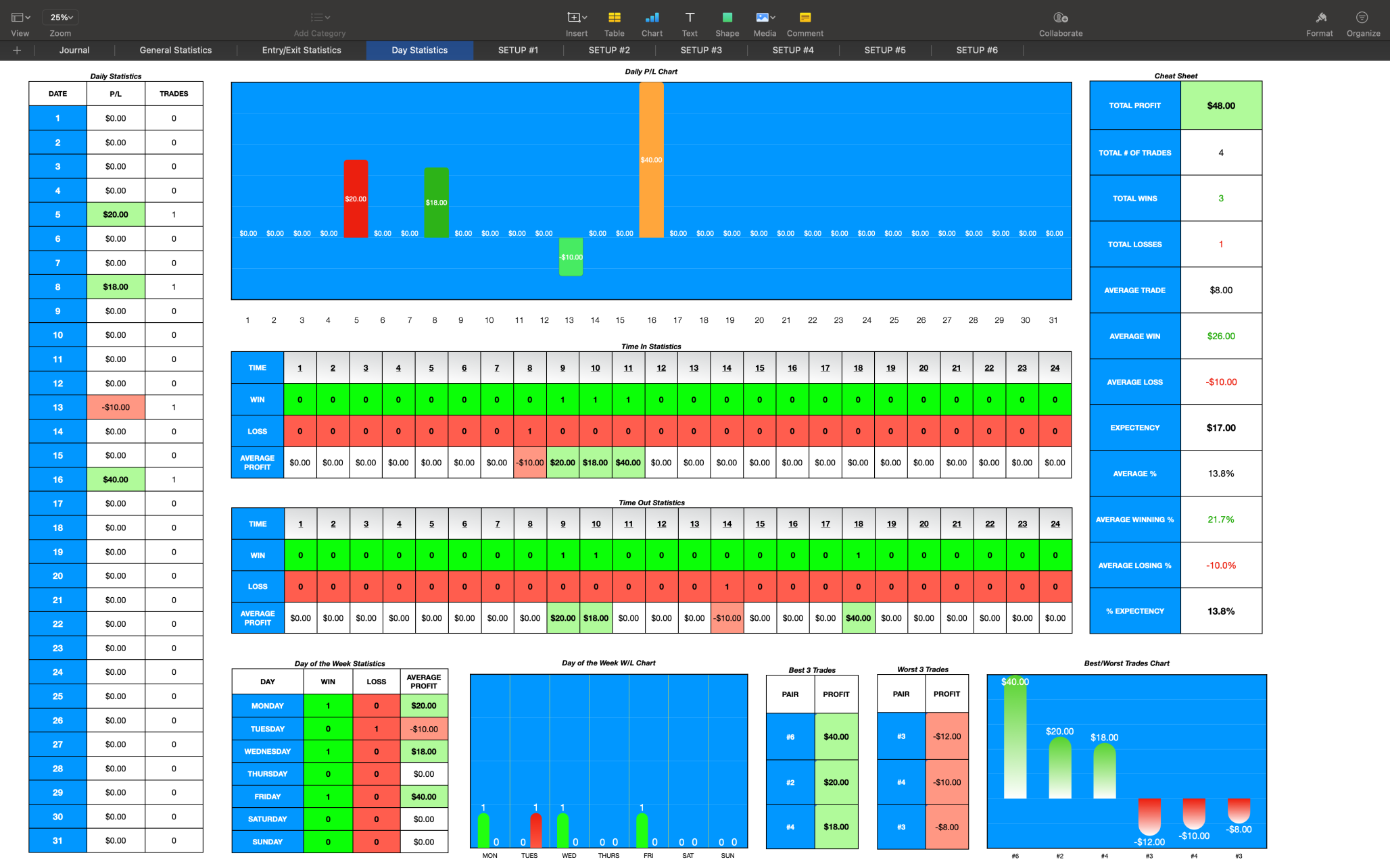 The Day Statistics page only tracks up to 31 days so if you want to track your performance for ever month separately rather than have one master journal, duplicate the file for every new calendar month.