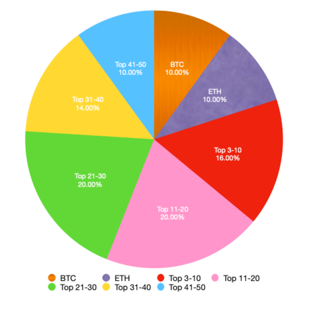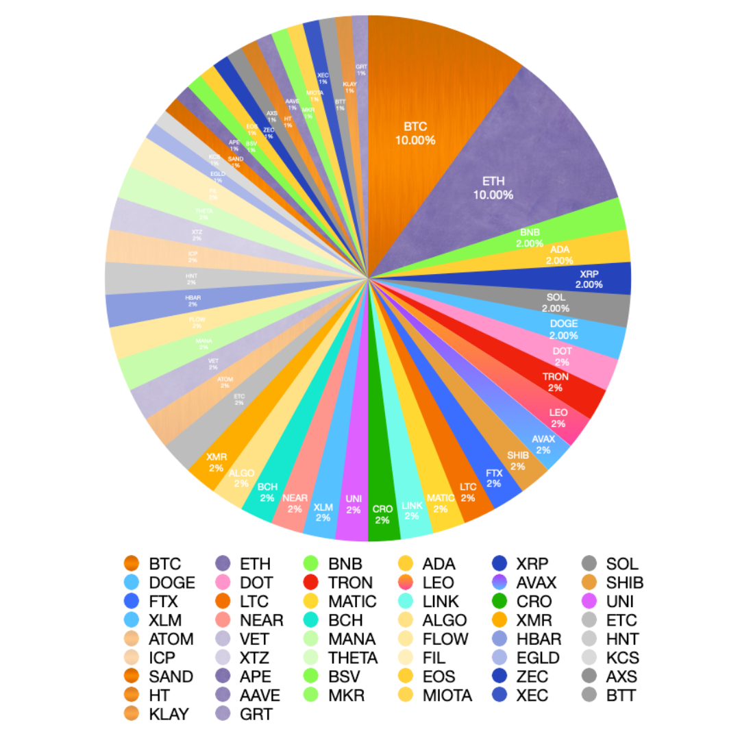 A relatively higher allocation is given to both BTC and ETH as minor volatility anchors, but the remaining portfolio is evenly distributed (2%) among each asset until the final 16, which are given a 1% allocation.