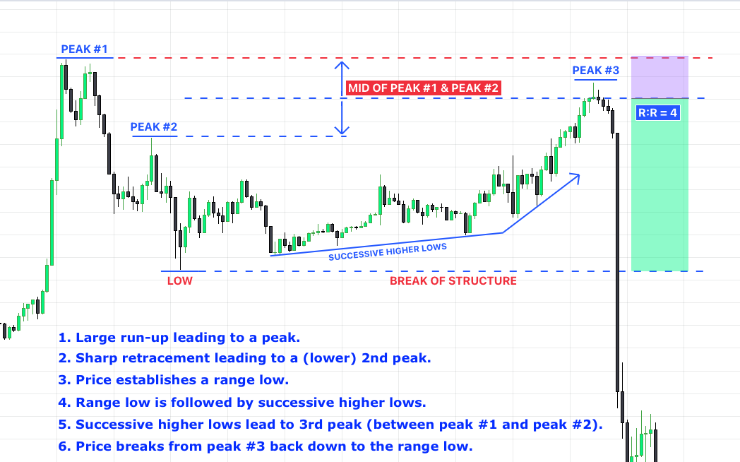 After the 2nd Peak and Range Low have formed, price experiences a cup-like bullish move putting in Successive HIGHER LOWS.