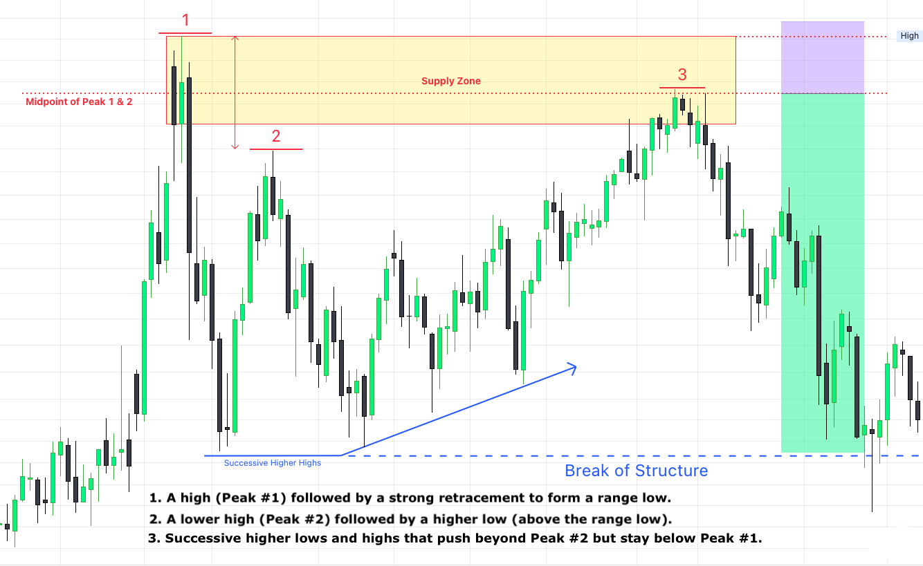 The pattern begins with a large Bullish Impulse leading to a PEAK or HIGH.