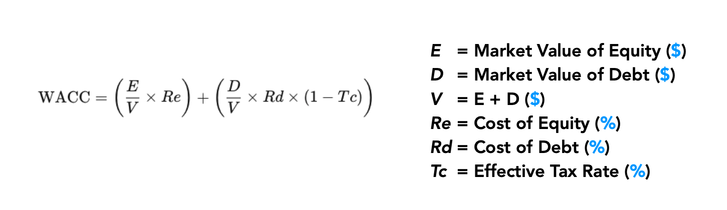 WACC = (Market Value of Equity (MVE) ÷ (MVE + MVD) x Cost of Equity ) + (Market Value of Debt (MVD) ÷ (MVE + MVD) x Cost of Debt x (1 - Effective Tax Rate)