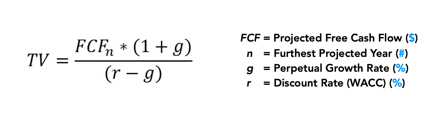 TV = FCFn x (1 + Perpetual Growth Rate) ÷ (WACC - Perpetual Growth Rate)