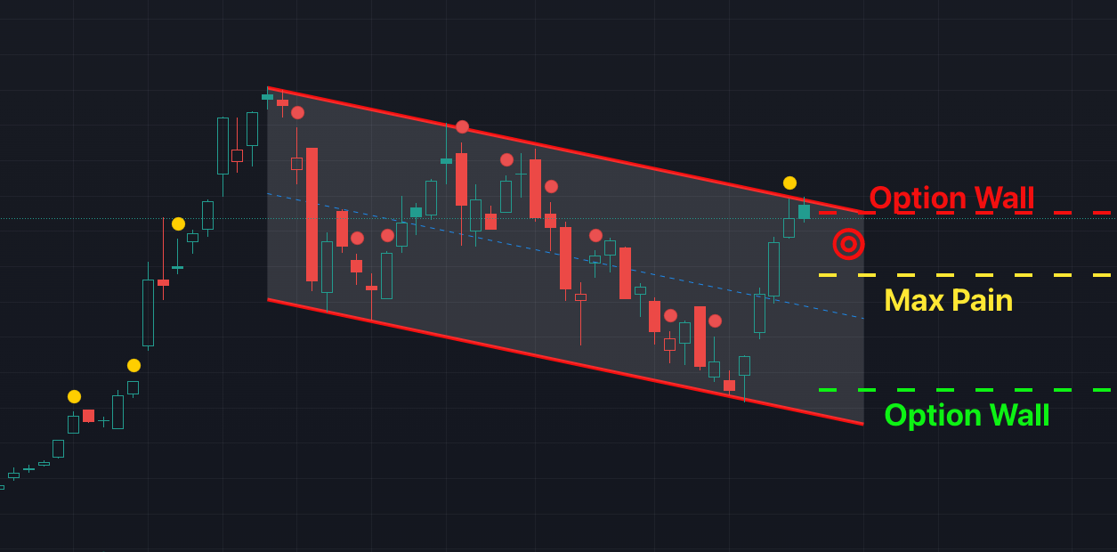 An option wall refers to a large delta-adjusted open interest on a certain strike. It is simply the open interest for that strike multiplied by its delta. It is important because it tells us how many shares market makers need to buy or sell to remain delta neutral.